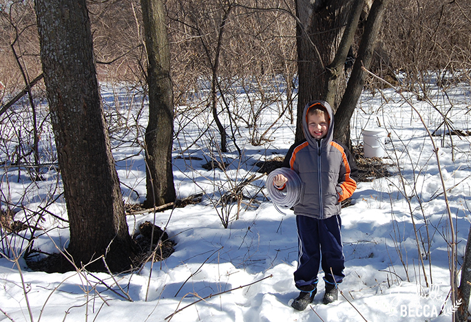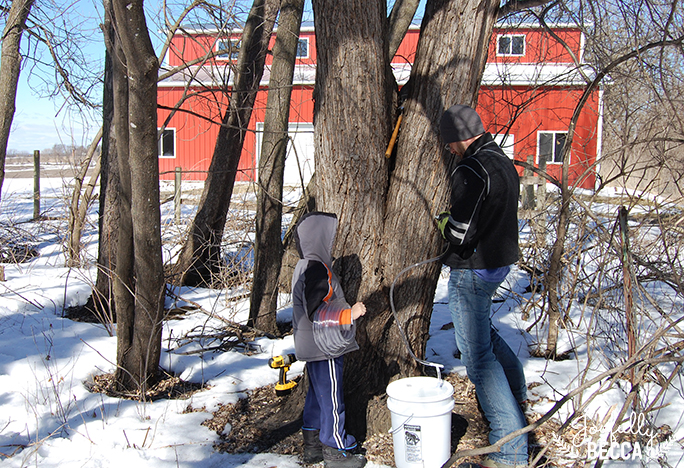 We can hardly believe it is already time. The past two years we haven’t tapped our maple trees until mid March, but here we are, end of February and the sap is flowing. Rory is trying something new this year, using tubes and five gallon buckets. He’s excited not to have to empty the bags each day and pour them into the buckets. In theory, he should be able to simply replace the bucket when it gets almost full with an empty bucket.
